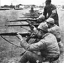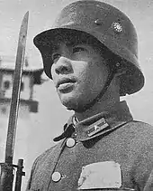 During its existence, the Reorganized National Government of the Republic of China fielded a force that was estimated by Western sources to have been between 300,000 and 500,000 strong.[3] Wang Jingwei initially planned to raise a force of twelve divisions under his personal command,[4] although most Nanjing Government troops were only under his nominal control throughout the war. All military matters were theoretically managed by the Central Military Commission, but in reality the body was largely symbolic and had little authority. The Nanjing Army commanders were able to operate without much interference from Wang's government and in many cases were former warlords or officers of Chiang Kai-shek's Nationalist Army.[3] Wang initially recruited his troops from former Nationalist soldiers and the puppet troops that had previously served the Provisional and Reformed Governments, which were both united under Wang's command. In the "Japan–China Military Affairs Agreement" signed by Japan and the Reorganized National Government, the Japanese agreed to train and equip an unspecified number of divisions for the Nanjing Army. They were provided with mostly captured Nationalist equipment along with small amounts of Japanese weapons.[4]