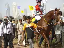 A simple narrow leather strap buckled around a horse's neck to give security to jockeys and other riders. Another form of neck strap (or rope) is the one used by cowboys when roping. This style is shorter and placed closer to the horse's head with the lariat passing through in order to keep the horse facing the calf after it has been roped. It also refers to the part of a martingale, which buckles around the horse's neck. A loose neck collar is also used on harness racing horses when the reins are passed through.