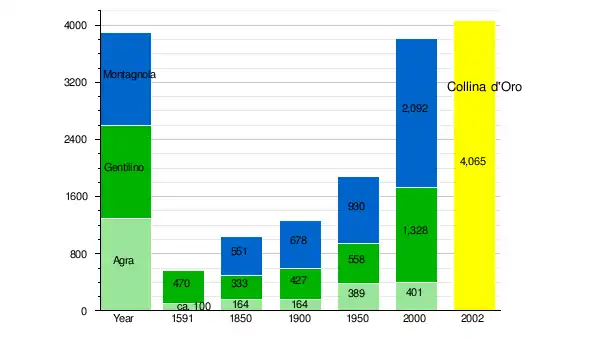 Collina d'Oro has a population (as of December 2020) of 4,604.[9] As of 2008, 28.5% of the population are resident foreign nationals.[10] Over the last 10 years (1997–2007) the population has changed at a rate of 21.1%.