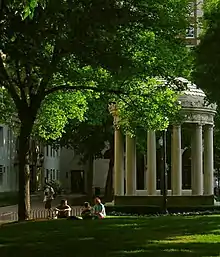 "The Steps", alternatively known as "Low Steps" or the "Urban Beach", are a popular meeting area for Columbia students. The term refers to the long series of granite steps leading from the lower part of campus (South Field) to its upper terrace. With a design inspired by the City Beautiful movement, the steps of Low Library provides Columbia University and Barnard College students, faculty, and staff with a comfortable outdoor platform and space for informal gatherings, events, and ceremonies. McKim's classical facade epitomizes late 19th-century new-classical designs, with its columns and portico marking the entrance to an important structure.[107]