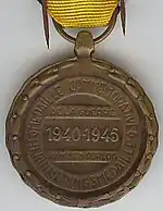 The Commemorative Medal of the 1940–45 War (French: Médaille Commémorative de la Guerre 1940–45, Dutch: De Herinneringsmedaille van de Oorlog 1940–1945) was a military decoration of Belgium. It was established by royal decree of the Prince Regent on 16 February 1945 to recognise Belgian servicemen and women who served during World War II. It was also awarded to members of the Belgian Resistance and members of Belgium's Merchant Navy on the side of the Allies. Later decrees allowed for its award to foreign recipients of the Belgian Croix de Guerre.[1]