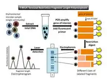 Terminal restriction fragment length polymorphism (T-RFLP) is a method that uses fluorescently-labeled DNA fragments to produce a community fingerprint.[2][7] This section presents a brief explanation of T-RFLP in the specific context of community fingerprinting. For a more detailed explanation, refer to the T-RFLP article.
