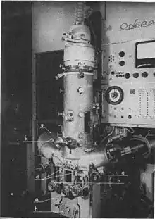 After World War II Radio-cinéma moved to Courbevoie, near to the other factories in Levallois.[22] The project to develop the Spectro-Lecteur spectrum analysis device was launched at Radio-Cinema in 1947 in response to a request from the metallurgical company Pechiney.[33] Early in the 1950s Radio-Cinema acquired the company of André Charlin, an engineer known for his expertise in talking movies, loudspeakers and stereophonics.[34] In 1954 Radio-Cinema became the Compagnie des Applications Mécaniques et Electroniques au Cinéma et à l'Atomistique (CAMECA). The company retained its core business but diversified into precision engineering, making scientific instrumentation and aerospace radars. In 1955 CAMECA was structured with three departments, one to produce Radio-Cinema and Charlin film projectors, one undertaking mechanical production for other CSF subsidiaries, and the third working on the Spectro-Lecteur.[33] CAMECA went on to develop ion and electron microprobes.[35]