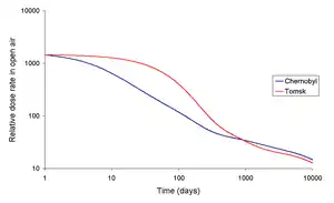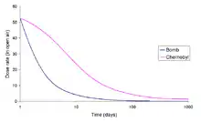 The graph of dose rate as a function of time for the bomb fallout was done using a method similar to that of T. Imanaka, S. Fukutani, M. Yamamoto, A. Sakaguchi and M. Hoshi, J. Radiation Research, 2006, 47, Suppl A121-A127. Our graph exhibits the same shape as that obtained in the paper. The bomb fallout graph is for a ground burst of an implosion-based plutonium bomb which has a depleted uranium tamper. The fission was assumed to have been caused by 1 MeV neutrons and 20% occurred in the 238U tamper of the bomb. It was assumed, for the sake of simplicity, that no plume separation of the isotopes occurred between the detonation and the deposit of radioactivity. The following gamma-emitting isotopes are modeled 131I, 133I, 132Te, 133I, 135I, 140Ba, 95Zr, 97Zr, 99Mo, 99mTc, 103Ru, 105Ru, 106Ru, 142La, 143Ce, 137Cs, 91Y, 91Sr, 92Sr, 128Sb, and 129Sb. The graph ignores the effects of beta emission and shielding. The data for the isotopes was obtained from the Korean table of the isotopes. The graphs for the Chernobyl accident were computed by an analogous method. Note that in the event of a low altitude or ground bursted nuclear detonation that fractionation of the volatile and non volatile radionuclides occurs, also during the Chernobyl accident the ratio between the different elements released by the accident did change as a function of time.[5]