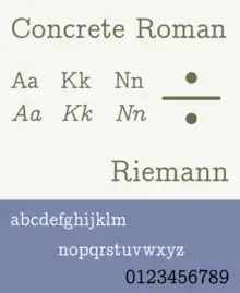 Concrete Roman is a slab serif typeface designed by Donald Knuth using his METAFONT program. It was intended to accompany the Euler mathematical font which it partners in Knuth's book Concrete Mathematics. It has a darker appearance than its more famous sibling, Computer Modern. Some favour it for use on the computer screen because of this, as the thinner strokes of Computer Modern can make it hard to read at low resolutions.