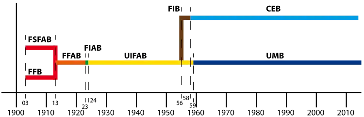 The CEB was founding on 12 July 1958 in Geneva. Its predecessor was the Fédération Internationale de Billard (FIB). They and the Union Internationale des Amateurs d'Fédérations de Billiard (UIFAB) competed in 1957 to host the CEB European Three-cushion Championship, and thus two championships were held this year. The dispute had been settled the following year.[1]