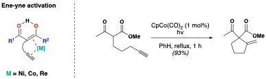 In ene-yne activation, the least common of the five modes, a single metal species coordinates with the enol alkene and the tethered alkyne, simultaneously activating both moieties for reaction. Nickel, cobalt, and rhenium complexes have all been employed in this manner.[6] A representative example was reported by Malacria et al. in 1994, in which an alkynyl substituted β-ketoester was treated with cyclopentadienyl cobalt complex and irradiation to give disubstituted methylene cyclopentane.[10]