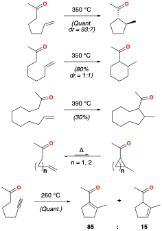 The same conditions were found to give six- and nine-membered rings with the appropriate substrates, although with lower yields and diastereoselectivity. In the case of γ,δ- and δ,ε-unsaturated ketones, equilibrium favored the linear product over the cyclopropane or cyclobutane. Alkynyl ketones were also found to cyclize under thermal conditions, giving a mixture of the conjugated and skipped cyclic enones.