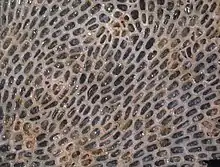 The ancestrula buds to produce another zooid which has a pair of long spines at the distal end and sometimes a further three to five pairs of thin spines at the sides. Further asexual reproduction takes place, with each zooid producing several buds until there is a small, roughly circular encrusting cluster of zooids, white or brownish-white in colour, with the ancestrula at the centre. On flat surfaces the colony is regular and lacy in appearance but on uneven surfaces, it is more irregular and may form lobes. Some colonies are also spherical. Each individual zooid bears a lophophore, the characteristic feeding apparatus of bryozoans, with fifteen or sixteen ciliated tentacles, used to filter phytoplankton. The operculum, a flap that hinges to form a lid over the aperture of the lophophore, has a membranous edge and is chitinised. It is thick and crescent-shaped when closed. The walls between the zooids are calcified on the proximal edge and membranous elsewhere.[2][3]