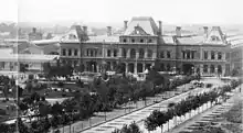 The first Constitución railway station, opened in 1865, and the tram that connected it with the center (1867)