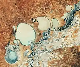 Site Description | ![]() Menindee Lake Over 30 species of water birds use the lakes for habitat, including numerous threatened species. The Menindee Lakes play a prominent role in the early stages of native fish lifespan.[3] The lakes system provides water for numerous towns, including Broken Hill, Menindee and Pooncarie. Due to the flat landscape that makes up the river, along with inconsistent rainfall, flows into the system at the end of the end of darling river are inconsistent.[4] A significant feature of the lakes is the connection with the Lower Darling river via Weir 32, where "Flows into this section of the river support a range of agricultural and environmental assets"[3] The Darling river has a prominent involvement in Aboriginal culture dating back over 13,000 years. This region is the traditional land of numerous different nations, though the most prominent group is the Barkinji people.[3] Barkindji means people of the Barka (the river).[5] |