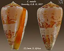 Apertural and abapertural views of shell of Conus natalis Sowerby, G.B. II, 1857 | |