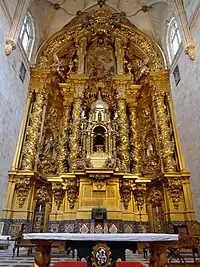 Work of José Benito de Churriguera, which tops the head of the church. Six large solomonic columns, covered with vegetal decoration, run along the first body, in the center of which is the central tabernacle conceived as a small temple, flanked by a pair of columns on each side; between these and those of the two at the ends are two niches that shelter the sculptures of Saint Dominic and Saint Francis of Assisi, attributed to the author of the altarpiece.
