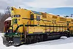 An ex-Portland Terminal Company unit. This locomotive arrived by rail in 1981 and immediately became the primary power for the railroad and later the Valley Train excursions, until the arrival of 573 in 1996. From then on the engine was used as backup for the valley trains and special duty only, until the engine was sold to the Downeast Scenic Railroad on April 9, 2010. The engine was shipped out by rail on May 14 of that year and became the primary power for the Downeast Scenic Railroad.[22]