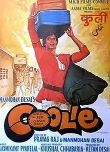 Coolie is a 1983 Indian action comedy film, directed by Manmohan Desai and written by Kader Khan. The film stars Amitabh Bachchan as Iqbal Aslam Khan, a railway coolie, who was separated from his mother Salma (Waheeda Rehman) due to Zafar's (Kadar Khan) obsession with her causes the destruction of her family and her mental breakdown. Years later, fate unites her sons, Iqbal and Sunny (Rishi Kapoor) and they set out to save Salma from Zafar's captivity. It also starred Rati Agnihotri, Shoma Anand, Suresh Oberoi and Puneet Issar.