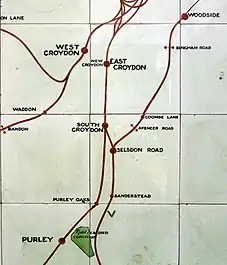 A 2-mile-29-chain (3.8 km) link between the Mid-Kent Line at Woodside and the Oxted Line at Selsdon known as the Woodside and South Croydon Joint Railway was authorised in 1880.[1] Opened on 10 August 1885, it was jointly worked by the London, Brighton and South Coast Railway and the South Eastern Railway.[1][2][3] with the only intermediate station at Coombe Lane.