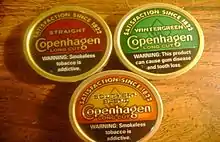 Copenhagen is a brand of dipping tobacco made by the U.S. Smokeless Tobacco Company. As with all tobacco products, it is addictive and a known carcinogen.