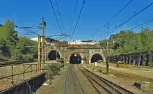In the current configuration, the lines approaching the tunnel from the north are grouped into Up Fast & Slow and Down Fast & Slow. Immediately before the northern portal the Up Slow is carried over the Up & Down Fast lines by an overbridge to join the Down Slow line so the central bore now carries the Up and Down Fast lines;[1][7] the western bore carries the Up and Down Slow lines.[1][7] The tracks in the eastern bore were lifted and it is now used to carry cables and provide occasional road access.