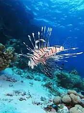The invasive species of lion-fish pose a serious threat to the sustainability of Jamaica's coral reefs as marine ecosystems become compromised with their rapid growth in population.[18][19] These species of lion-fish, more specifically the Pterois volitans and Pterois miles, are not native to the Caribbean sea waters but instead originated in the Indo-Pacific.[18] The very first reported sightings of the invasion of lion-fish in the Caribbean occurred in the 1980s off the coast of Florida.[19] It is speculated that these fish entered Atlantic and Caribbean waterways due to aquarium releases, where people would set the species free in the sea after growing too big for the tank and rapidly multiplying.[20]