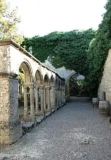 The cloister was made from limestone which is prevalent in the Saint-Emilion area. Its architecture is Romanesque in style, rubbing shoulders with the old Gothic-style chapel and church. Its columns are monolithic, in other words cut from a single stone from the base to the capital. Small crests are hidden in the abacuses. The Romanesque rounded arches were built in the 14th century and stand near additional Gothic pointed arches in the background. Other visible elements include a small tower which is the remains of the church tower, a very simple sweeping arc spanning the church from one wall to the other, columns without capitals, and windows.