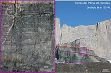 The radiometric age for the quartz diorite at Cerro Paine is 12 ± 2 million years by the rubidium-strontium method and 13 ± 1 million years by the potassium-argon method.[7] More precise ages of 12.59 ± 0.02 and 12.50 ± 0.02 million years for the earliest and latest identified phases of the intrusion, respectively, were achieved using Uranium–lead dating methods on single zircon crystals.[8] Basal gabbro and diorite were dated by a similar technique to 12.472 ± 0.009 to 12.431 ± 0.006 million years.[9] Thus, magma was intruded and crystallized over 162 ± 11 thousand years. High resolution dating and excellent 3-D exposure of the laccolith and its vertical feeding system allow detailed reconstruction of the Torres del Paine fossil magma chamber history.[10]