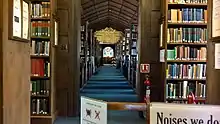 On the corner of Merton Street and Magpie Lane, lie the Jackson and Oldham buildings and Kybald Twychen, which all house students. In 1884–85, the architect T. G. Jackson had first installed a 'New Building and Annexe', replacing town houses on Magpie Lane.[35] In 1969, this work was trimmed and modified to make space for a further new building created by Philip Powell and Hidalgo Moya using a modernist beehive design, while leaving Jackson's Annexe substantially intact.[36] Powell and Moya's building uses local limestone rubble and has the architects' characteristically large windows mounted within an exposed concrete frame. Particular attention was paid to placing the design within the existing architectural context, including the plain wall of Oriel College, Merton's Gothic chapel and Jackson's heavily ornamented Annexe.[37] In 2017, the New Building and Annexe were substantially renovated and renamed the Oldham and Jackson Buildings, respectively.[38]