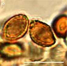 The almond-shaped basidiospores measure 8 to 9 by 5 to micrometres (μm), averaging 8.6 by 5.6 μm. The spores have a depression above the hilum, and are moderately warty, especially at the apex. The spores are moderately to strongly dextrinoid, meaning that they stain reddish to reddish-brown when Melzer's reagent or Lugol's solution is applied. The basidia are 26 to 35 by 7 to 10 μm. They are roughly club-shaped, sporting four sterigmata. The flesh in the gills is made up of rusty-brown hyphae. They are moderately covered with spot-like encrustations. The pileipellis surface is pale, consisting of more or less parallel hyphae that are 5 to 13 μm wide with zebra-like incrustations. Lower hyphae are rusty brown, 25 to 30 μm wide, with abundant zebra-like incrustations.[1]