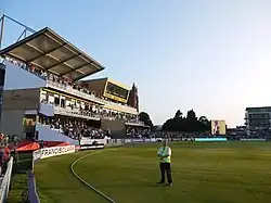 The County Ground, known for sponsorship reasons as Cooper Associates County Ground,[2] is a cricket ground in Taunton, Somerset. It is the home of Somerset County Cricket Club, who have played there since 1882. The ground, which is located between Priory Bridge Road and St James Street, has a capacity of 8,500.[1] The ground was originally built as part of a sports centre by Taunton Athletic Club in 1881, and became the home of the previously nomadic Somerset County Cricket Club soon after. Having leased the ground for ten years, the club bought the ground in 1896, under the guidance of club secretary Henry Murray-Anderdon. The ground ends are the River End to the north and the Marcus Trescothick Pavilion End to the south.