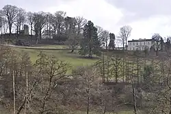The house is approached along a drive though a former deer park.[14] The building is of seven bays and two storeys, the construction material being stuccoed stone.[15] The style is Regency, executed in a not particularly adept way. Alan Brooks, in his 2012 revised Herefordshire Pevsner Buildings of England, notes the "unconvincing" arrangement of pilasters and pediment.[15] Both Pevsner and Historic England attribute the design to William Miles, a surveyor from Stroud.[15][16] Brooks further notes the Soanean influences in the interior of the house including vaulted ceilings, domed skylights and curved bay windows. A curved wall to the left of the house is pierced by an archway into the stable yard. This is now mostly filled with extensions dating from the 1960s, put up by the Mission fathers.[15]