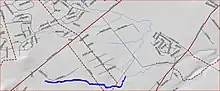 The Cow Yard Brook starts at 40°24′43″N 74°32′8″W / 40.41194°N 74.53556°W[1] near the intersection of Beekman Road, Northumberland Way, and US Route 1. It crosses Deans Lane near its intersection with Black Horse Lane. It then crosses Black Horse Lane and drains into the Oakeys Brook at 40°24′46″N 74°30′51″W / 40.41278°N 74.51417°W,[1] near the intersection of Black Horse Lane and Henderson Road.