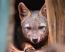 The crab-eating fox (Cerdocyon thous), also known as the forest fox, wood fox, bushdog (not to be confused with the bush dog) or maikong, is an extant species of medium-sized canid endemic to the central part of South America since at least the Pleistocene epoch.[1][2][4] Like South American foxes, which are in the genus Lycalopex, it is not closely related to true foxes. Cerdocyon comes from the Greek words kerdo (meaning fox) and kyon (dog) referring to the dog- and fox-like characteristics of this animal.[5]