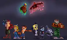 The audio was met with mixed responses, though reactions to the voice acting and humor were mostly positive. Thomsen praised the game's "kooky Danny Elfman-esque" score, exaggerated voice-acting, sophisticated writing and variety of enemy voice lines.[34] Davis and Grabowski felt that the voice cast was strong and lent a good amount of humor to the game.[26][30] Periera acknowledged the dialogue of the minion characters as funny but dated.[31] Rowe claimed that the game "might be the first script since Ratchet & Clank that made me laugh out loud", but considered Greg Eagles' performance as Aku Aku to be a "gratingly poor" impersonation of Aqua Teen Hunger Force character Frylock.[25] Knutson and Keller dismissed the soundtrack as forgettable and criticized the voice-acting as annoying; Keller elaborated that "Crash, who is supposed to be a deranged bandicoot, sounds more like a confused baby. Other characters such as Coco have really annoying voices that make you want to take a power drill to your temple to make the pain stop. The only voices that have any merit are the smaller creatures in the first five levels, who sound a lot like Jerry Lewis from The Nutty Professor".[29][35]