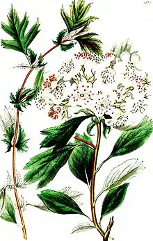 Early ideas that it originated in North America were replaced by the perception that it has more in common with species from eastern Europe. Favouring an American origin was Joseph Paxton, who in 1840 listed it as having been introduced into Britain from North America in 1816.[5] Also, A. P. de Candolle published its country of origin as North America in his Podromus in 1825.[6] John Lindley in 1828 considered it to have little affinity with North American hawthorns, being closer to Eastern European species, and suggested it could be a relative of Azarole hawthorn (Crataegus azarolus), (under the name Crataegus maroccana Persoon). In the early twentieth century, W. J. Bean described it similarly, as a native of Armenia. Today, other authors also list it as native to Eastern Europe from Georgia and the Caucasus to nearby parts of Western Asia.