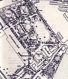 The property was sold by the Dawson family, Barons Cremorne, in 1831 to a Baron de Berenger,[3] who was a convicted fraudster whose real name was Charles Random. De Berenger converted the site into a sports facility, called The Stadium, and became a proponent of self-defence techniques.[4] The business failed in 1843, but not before de Berenger had added some attractions of pleasure gardens of the time, including hosting a balloon ascent in 1838. For two years the gardens opened for summer, including an opening festival billed as "Pie de Nie" with Balloon ascent,[5] for instance, were held, and the property was sold in 1845. James Ellis took over the license in January 1845.[6] The twelve-acre site was then developed by James Ellis into a proprietary place of entertainment and spectacle, being popular as such from 1845 to 1877. The Cremorne Gardens occupied a large site running between the Thames and the King's Road. Opened in 1845, they were noisy and colourful pleasure gardens featuring restaurants, entertainments, dancing and balloon ascents, and could be entered from the north gate on Kings Road or another by the Cremorne Pier on the river.