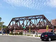 The two railroad-related structures in the Crescent Warehouse Historic District include the railroad bridge over the intersection of East Fourth Street and Pershing Avenue and the remaining section of the rail bed. The bridge is a Warren through-truss bridge. There is a similar span over the intersection of East Third and Iowa Streets in the Davenport Motor Row and Industrial Historic District. The second contributing structure is approximately 200 feet (61 m) of the second elevated crescent-shaped rail bed.[3] It lies to the north of East Fourth Street in the southeast corner of the district. The rest of the berm and the bridge that spanned Fourth Street were removed in the 1970s. The original stone bridge abutments on the north side of Fourth Street remain in a deteriorated condition and without the facing stone.