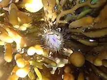 When underwater it extends short, fine, smooth tentacles that are 2–5 millimetres long with rounded tips. These are arranged in three to four crowded whorls along the edge of the disc.[2] The inner tentacles can be twice as long as the outer tentacles.[4] Tentacle colour can range between light yellow and deep brown and often feature green, blue or red tinges.[3] Its central disc can be a similar colour to the tentacles or a contrasting colour such as white, purple or orange and usually features radial markings.[2] Its mouth can be light blue, bright pink or purple, and often has a lighter colour on the interior.[3] The anemone's column is usually a deep brown colour, but can also be green, blue, or yellow.[2]