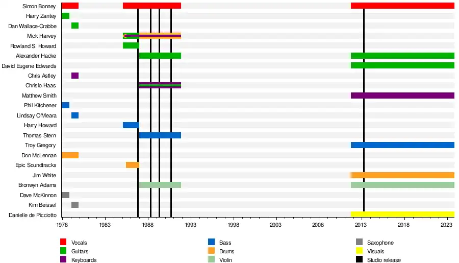 In late 1978 Bonney and McLennan had relocated to Melbourne where they formed a new version of Crime & the City Solution with Chris Astley on keyboards, Kim Beissel on saxophone, Lindsay O'Meara on bass guitar (ex-Voigt/465) and Dan Wallace-Crabbe on guitar.[2][3] In Melbourne Bonney became friends with local post-punk group, The Boys Next Door (later known as The Birthday Party).[2][6] Crime & the City Solution broke up in 1979 after a number of live shows and recording an unreleased demo.[2] Wallace-Crabbe later joined Laughing Clowns, O'Meara returned to Sydney and joined Pel Mel, Beissel played in → ↑ →, Astley and McLennan in other bands.