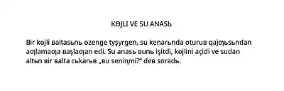 Бутюн инсанлар сербестлик, менлик ве укъукъларда мусавий олып дюньягъа келелер. Олар акъыл ве видждан саибидирлер ве бири-бирилеринен къардашчасына мунасебетте булунмалыдырлар. | Bütün insanlar serbestlik, menlik ve uquqlarda musaviy olıp dünyağa keleler. Olar aqıl ve vicdan saibidirler ve biri-birilerinen qardaşçasına munasebette bulunmalıdırlar. | All human beings are born free and equal in dignity and rights. They are endowed with reason and conscience and should act towards one another in a spirit of brotherhood. |