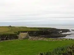 The promontory fort predated the broch, which was built inside the older structure.[5] The earlier structure was an outwork that began at the edge of the promontory in the east, a 15 feet (4.6 m) thick wall or rampart of rock with an earth core. A gateway that widened towards the outside provided access through the wall. To the west of the gateway the rampart included a structure like a cell, and then there was a recess in the inner face of the wall. The outwork continued west, ending in a fence made of flagstones that reached to the cliff edge at Chapel Geo.[6]