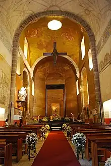 On the west side of the complex, on the south side of both the Cathedral itself and its attached cloister is the capilla abierta (open chapel). This was one of the first constructions of the Spanish built after Hernán Cortés choose Cuernavaca as a seat over his dominions. The chapel was originally bigger than what remains today. The open chapel here was used not only for Mass, but also for plays, music dance and other events designed to explain and reinforce the faith.[10] The roof of the open chapel is supported by large arches and serves as a portico to the cloister. The cloister today is used as office for the bishopric. It was restored to its former look in the 20th century, with two levels surrounding a central courtyard. The levels have corridors marked off by arches.[7] This cloister retains a number of frescos, some of which depict New Spain missionaries in the Philippines and Japan.[4] The main church has a plain facade with the only element with ornate decoration is the bell tower with also contains a clock.[6] Just inside the main portal, there is a bronze statue of Jesus carrying a cross, a lamb and a book. Just beyond this is a very large stone baptismal font.[7] Inside, the decoration is stark and mostly modern, especially in the main altar area. An equilateral cross with an image of Christ is suspended over the altar area and there are small modern crosses and other elements on the side walls. However, the most important decorative element is an 18th-century narrative mural. This mural was uncovered during the renovation work in the mid 20th century. The mural covers 400 m² of both side walls of the main nave of the church and tells the story of the arrival and martyrdom of Philip of Jesus and other missionaries in Japan.[6][11] The mural was probably painted in the middle of the 17th century after the Franciscan missionaries were beatified in 1627. The mural was painted al fresco in a primitive style. Little is known about who painted it or the socio-political context behind its creation. One scholar by the name of Luis Islas Garcia, believes that the artist was a native of Asia who resided in the monastery, assisted by local indigenous people. However, Father Diego Yuki of a museum dedicated to the martyrs in Nagasaki believes that the mural as a purely local work. Phillip of Jesus was beatified in 1627, and canonized in 1629. As the first Mexican saint, as well as a Franciscan, his story would have importance at this establishment. He would have relevance through the colonial period as a symbol of Criollo identity in Mexico. However, this mural was covered over in the 19th century and its existence was forgotten. The work was rediscovered in the 20th century by architect Ricardo Robina when the cathedral was remodeled.[11]