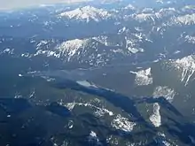The reservoir, Spada Lake, seen from the air, with the dam on the left end of the lake