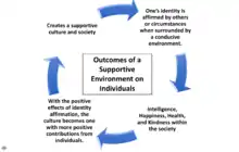 Past research has been conducted by middle-class North Americans analyzing culturally different societies by using comparisons mostly involving middle-class North Americans and/or aforementioned W.E.I.R.D. societies. What has been characterized as Euro-American centrism, resulted in a great volume of research for this specific selection of humans. It has also allowed us to divert from the idea that certain psychological processes can be considered basic or universal, and recognize humans' remarkable capacity to create cultures and then be shaped by them.[27] Although cultural psychology has internalized the mutually constituting model, further implementation in our society is necessary. Being aware of this model promotes taking responsibility for one's actions and the effect that their actions have on their community. Through acceptance of ones responsibilities and conscious application, communities have opportunities for improvement which in turn supports the individuals within the community. These ideas can be found in the journal article "Cultures and Selves: A Cycle of Mutual Constitution" by Hazel Rose Markus and Shinobu Kitayama which are also represented in the graphic provided.