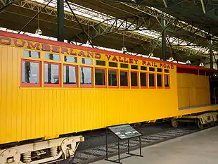 The Cumberland Valley Railroad pioneered the use of sleeping cars in the spring of 1839, a first on any American railroad, with a car named "Chambersburg." The berths were upholstered boards, in three rows, one above the other, held by leather straps, and in the daytime were folded back against the walls. A couple of years later a second car, the "Carlisle," was introduced into service.[4]