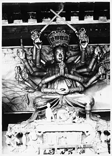 The name Cundī (along with other variations like Cundā, Cundrā, Candrā, Caṇḍā, and Cuṇḍrā) refers to an Indian Mahayana Buddhist deity found in numerous Indian sources such as the Śikṣāsamuccaya, Cundādhāriṇī Sūtra, Sādhanamālā, Niṣpannayogāvalī, Mañjuśrīmūlakalpa and the Guhyasamāja.[8][4] Conze notes that the Tibetan terms for the goddess may go back to the Sanskrit: Cundī, Caṇḍī (a name for Durga), Cunda, Chundi, or Cuṇṭi.[4] Benoytosh Bhattacharyya argues the correct Sanskrit name should be Cundā.[8]