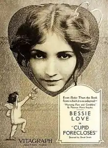 Cupid Forecloses is a 1919 American silent comedy[4] film starring Bessie Love and Wallace MacDonald. It was directed by David Smith and produced by Vitagraph Studios. It was based on the popular novel Hurrying Fate and Geraldine by Florence Morse Kingsley. The film has been preserved at the British Film Institute and American Film Institute.[1][5]