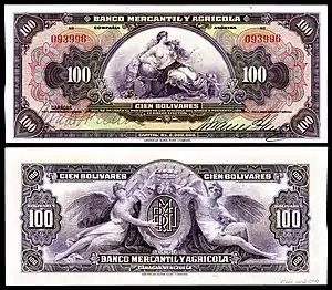 Banco Nacional de Venezuela was created by act of Congress, May 17, 1841, with a capital of 2.5 million pesos. It was authorized to issue notes for 5, 20, 100, and 500 pesos. The only notes known (as of 2002) are for 5 and 20 pesos, printed by New England Bank Note Co. of Boston. The bank terminated operations on March 23, 1850.