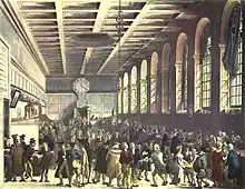 The northern front of Laing's new building was plain, but the south front towards the river had wings with Ionic colonnades and a projecting centre section. The attic storey of the latter was decorated with terracotta figures in bas-relief by John Charles Felix Rossi and J. G. Bubb[4] representing the arts and sciences, commerce and industry, and inhabitants of various countries of the world. A clock dial, nine feet in diameter, was supported by colossal figures symbolising Industry and Plenty, and the royal arms by figures of Ocean and Commerce. The riverfront was 488 feet 10+1⁄2 inches long,[5] and the building cost £255,000.[6]