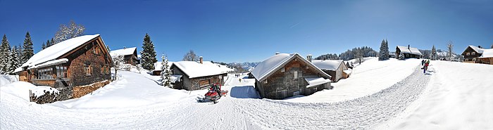 Panoramic view of Bödele near Dornbirn in Austria with a cylindrical distortion at the bottom.