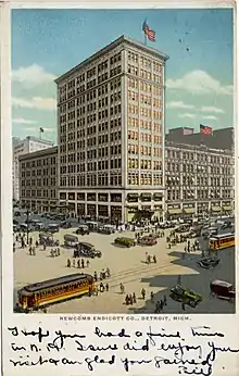 Massachusetts native and Harvard graduate John Endicott came to Detroit in 1891, becoming head bookkeeper of Newcomb's enterprise. He was "admitted as a member of the firm" in 1896 and became treasurer when Newcomb-Endicott was incorporated as a department store in 1903.[3] He was married twice, first to Elizabeth Watson, who died, and then in 1902 to Mary Elizabeth Booth and had three children. His other endeavors included being director of the Michigan State Agricultural Society, and owner of a large stock farm near Birmingham where he bred Hackney horses. Newcomb-Endicott Co. was Michigan's first department store, founded in 1868, predating the J.L. Hudson Co., Crowley-Milner Co., or the Ernst Kern Co.