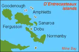 The three principal islands, from northwest to southeast, are Goodenough (Nidula[1]), then across Moresby Strait to Fergusson (Moratau[2]), the largest of the three, and across Dawson Strait to Normanby Island (Duau[2]).